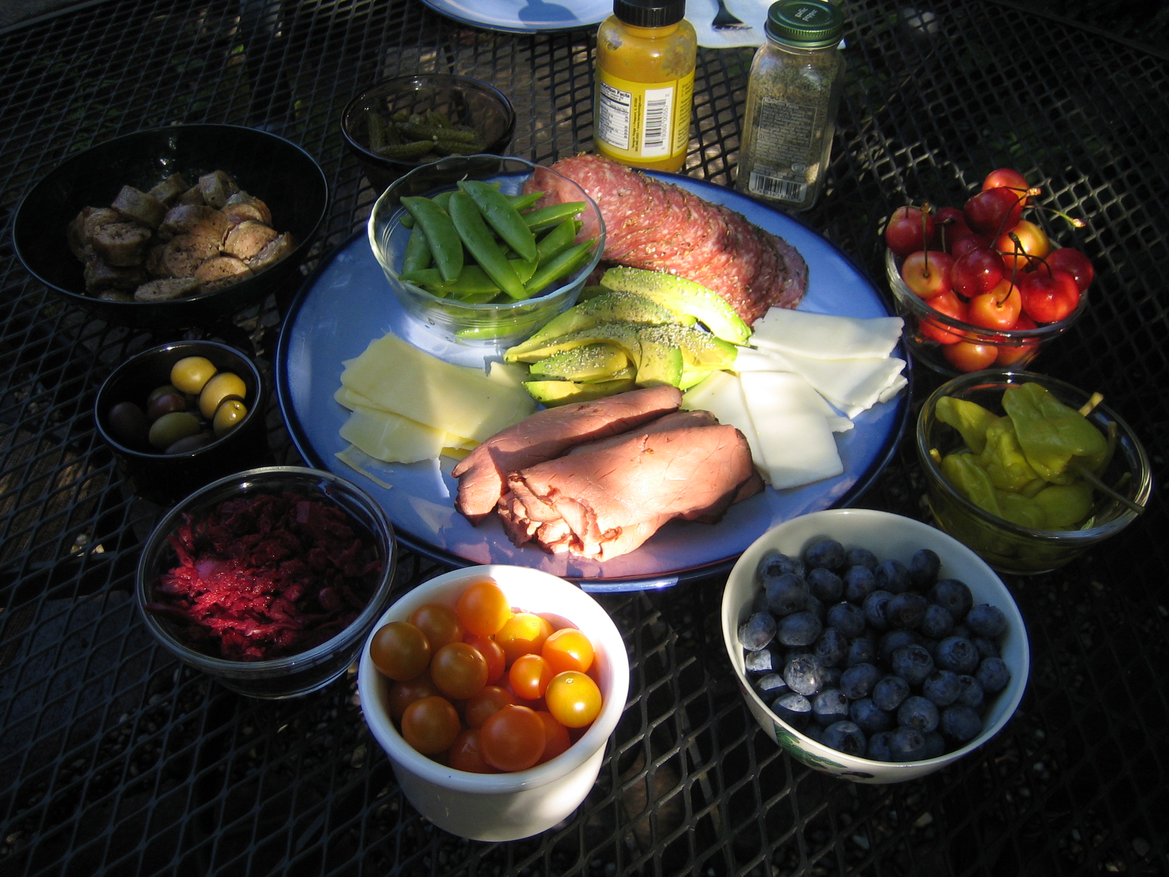 I created this simple but tasty and festive meal from a few items I happened to have sitting in my refrigerator at home and enjoyed it on my patio with a friend. I didn’t feel like cooking and didn’t want to spend the money eating out. This can be done with leftovers or whatever assorted delectable items you might have in your fridge or garden.